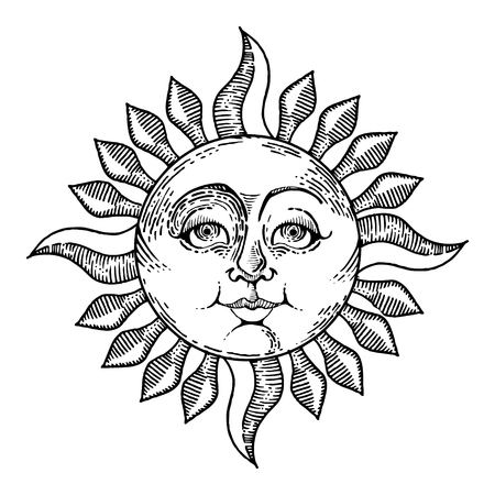 太陽と月の顔と雲のベクター イラストを彫刻します スクラッチ ボード スタイルの模倣 手描きイメージ のイラスト素材 ベクタ Image