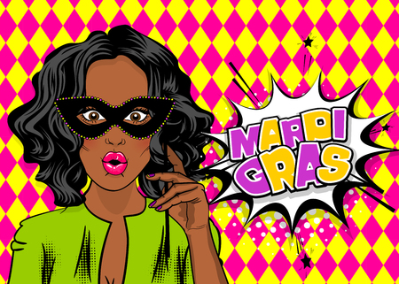 カラーベクターポップアートスタイルイラスト 偽の顔をしたアフリカ系アメリカ人の女の子 色の黒い女は人工的な笑みを浮かべてマスクを持つ 怒った女は幸せそうな顔をして面を手に持つ のベクター画像素材 ロイヤリティフリー